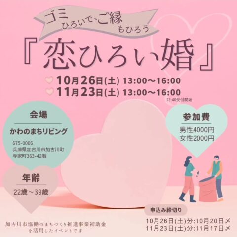 「ゴミひろいで、ご縁を繋ぐ」 ごみひろいのプロをお呼びして加古川市で、 恋ひろい婚を開催します。 会場は、 10月.....