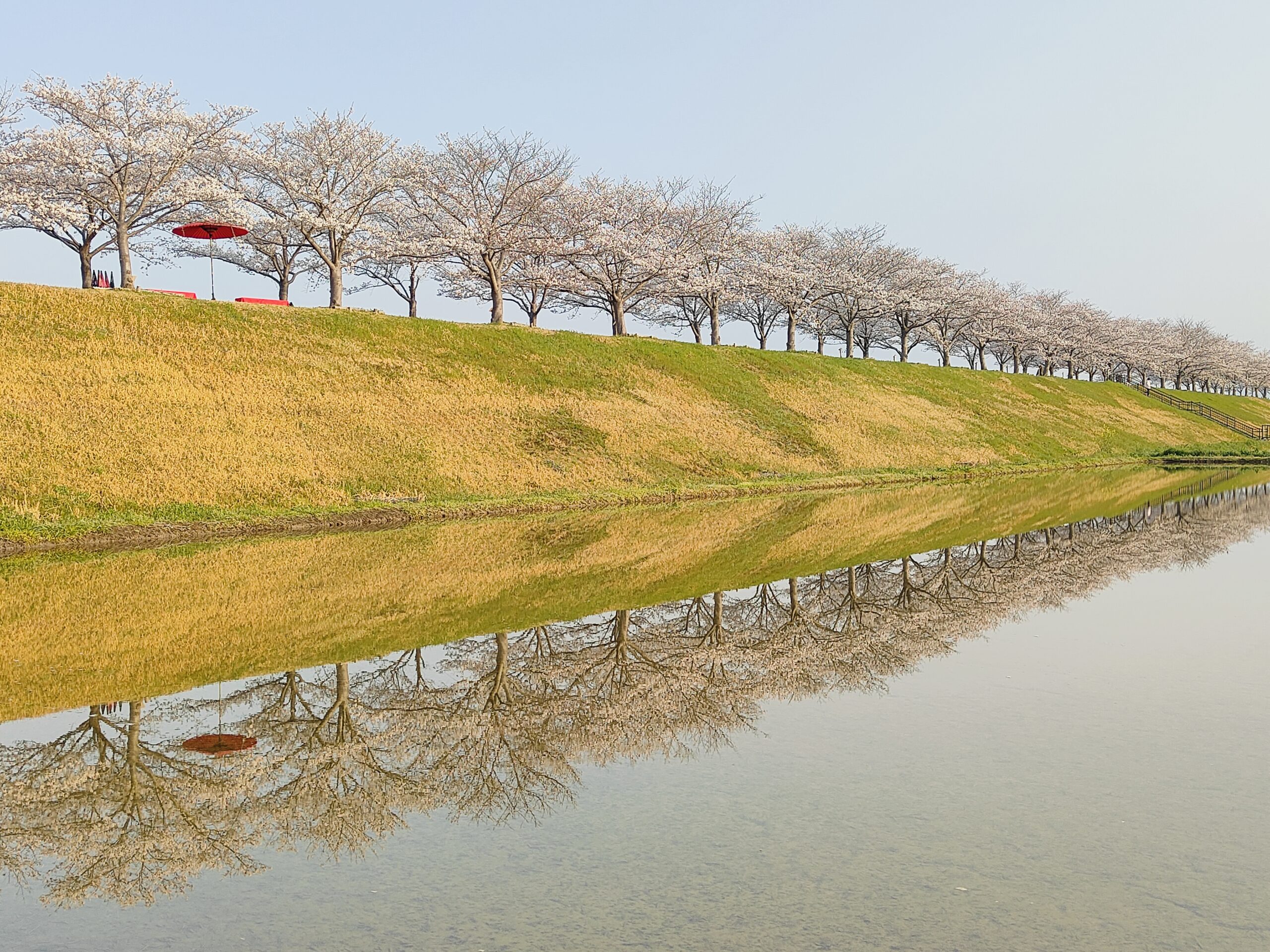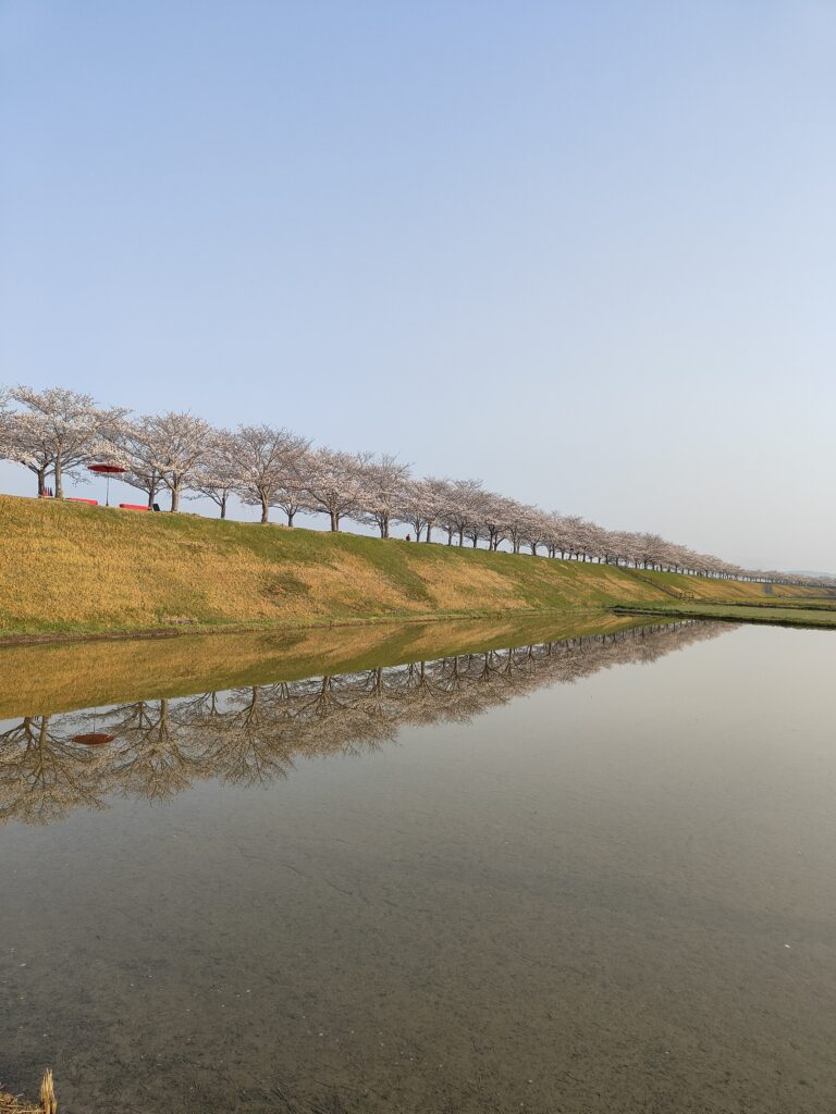 また風のない天気の良い日に田んぼの水面に桜が映り込む「逆さ桜」も映えスポットですよ(^^)