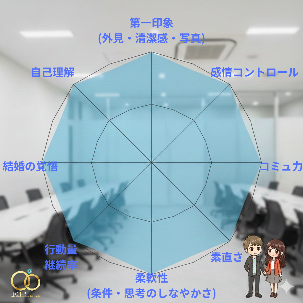 そこでF&P BRIDALでは、婚活の状態を感覚ではなく構造として把握するために、独自設計のスパイダーチャートを導入しています。