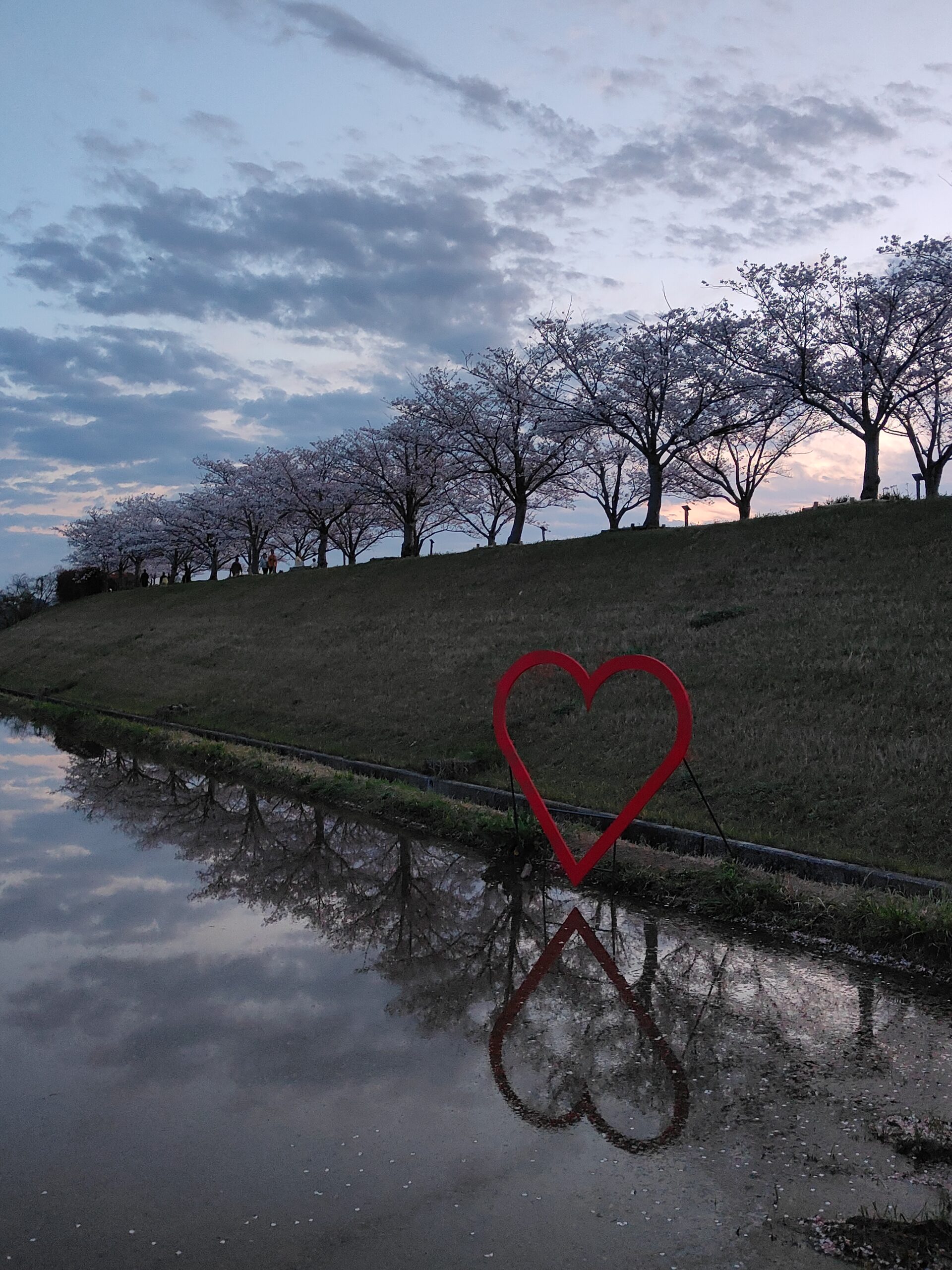 水面に映る桜と、印象的な赤いハートのオブジェ✨