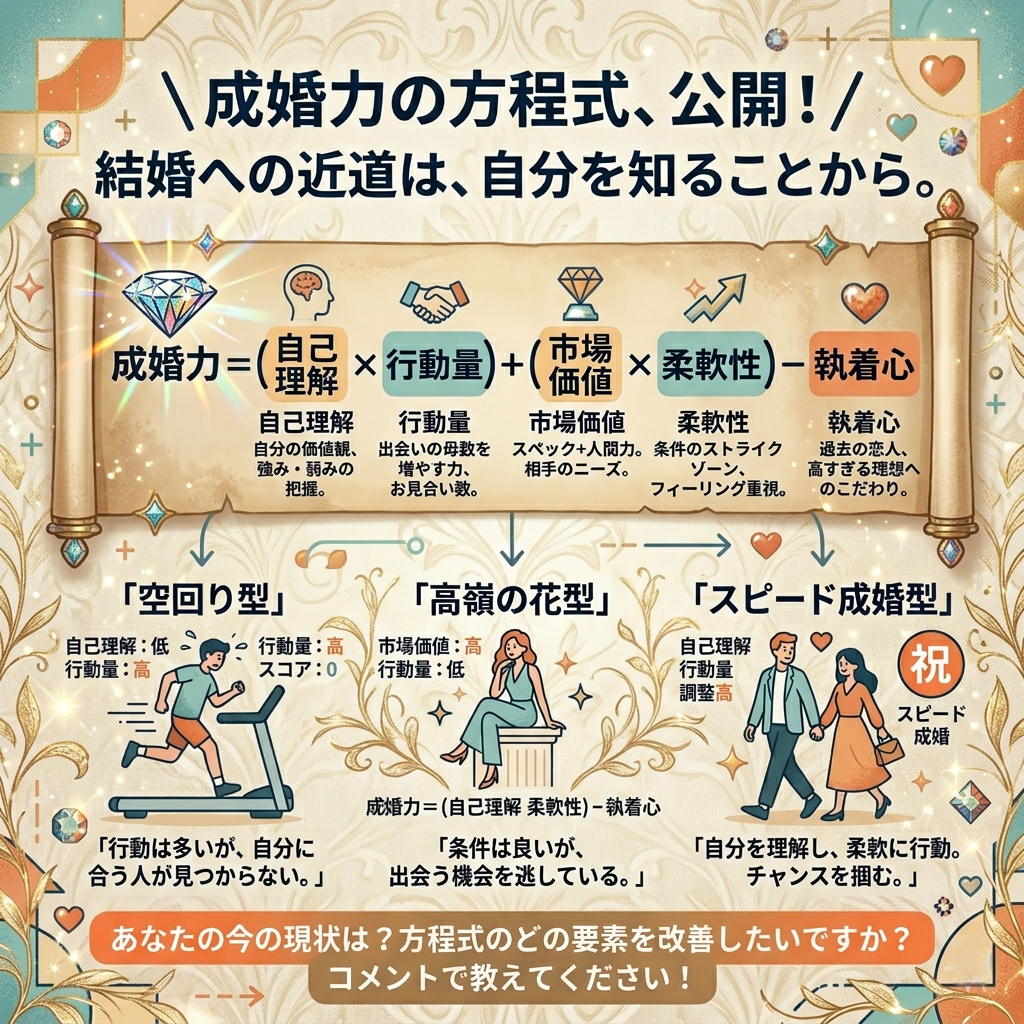 ​今回は、婚活迷子から脱却し、最短で理想のパートナーと出会うための「成婚力の方程式」を詳しく解説します。今の自分に足りない要素は何か、ぜひチェックしてみてください!
