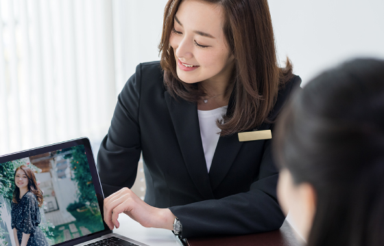 F&P BRIDALの独自の目線から、時には身だしなみ等のアドバイスも行っており、例えば男性の場合は髪型・ファッションや姿勢、女性もファッション・メイクや表情などのアドバイスをします。また、男女共通のサービスとして、自分に似合うヘアスタイルやファッションに不安があるという方には、提携の美容室のご紹介やお買い物同行サービス(オプション)を通して、ベストな状態で活動ができるようしっかりとサポートします。